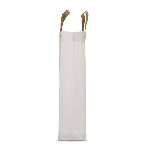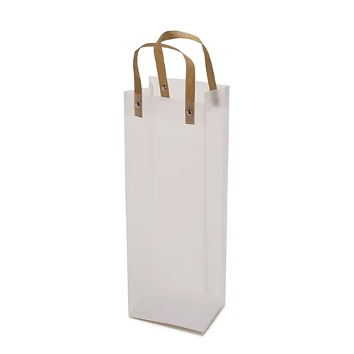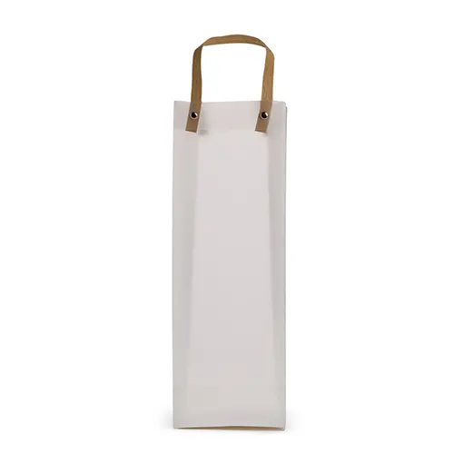 Sacola plástica com formato retangular, acabamento fosco e alças em papelão fixadas por botões metálicos.