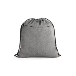Sacola tipo mochila em algodão reciclado (140 g/m²), com bolso frontal com fecho discreto e alças em algodão. 370 x 410 mm