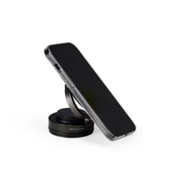 Suporte magnético em plástico ABS com articulação em diferentes ângulos e rotação de 360 graus no próprio eixo. Possui superfície magnética para fixação de aparelhos na vertical ou horizontal, compatível com dispositivos magnéticos ou com o anel adaptador incluso. Conta com mecanismo giratório para pressão da ventosa em superfícies lisas. Acompanha anel magnético adesivo, placa plástica com adesivo, kit de lenços e chave Allen.