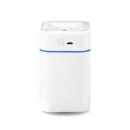 Umidificador de ar com difusor de óleo essencial à base de água via USB. Feito com ABS reciclável+ PP, com capacidade de 260ml. Na parte superior tem um faixa que acende, ideal para uso em escritório ou em casa.